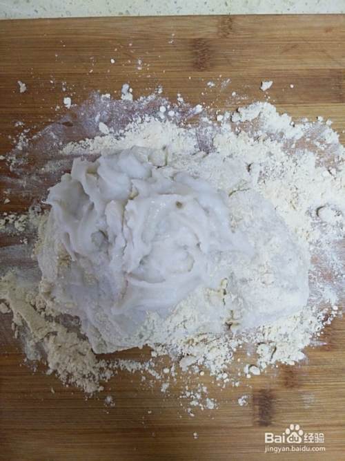 将黄豆粉铺在案板上,将糯米团取出,放在上面