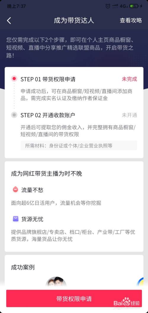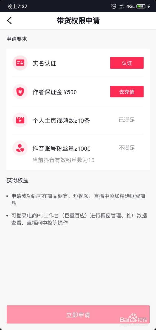 需进入抖音我的页面的三横标准,选择创作者服务中心的商品橱窗,进入成为带货达人中的带货权限申请,点击立即申请即可。