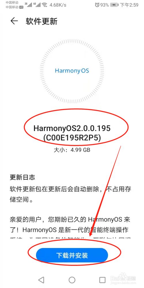 点进去可以看到鸿蒙系统的大小,接近5个G,激动的点下「下载并安装」: