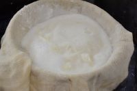 将磨好的豆浆倒在铺有沙布的滤网上,将豆浆过滤。