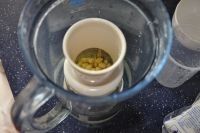 将泡好的豆子放在磨豆器里。加入清水磨出豆浆。
