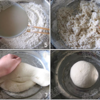 3等面膨胀起来 撕开就呈蜂窝状并略有酸味时 这时可把面取出放在面板上在面中间按个坑加上适量的食用小苏达 在倒点醋 边加边揉 用手撕开闻不到酸味时就揉好了 把揉好的面揉成圆条,然后用手揪成小块用手在面板上将面块旋 转轻揉 制成圆形馒头 揉好的馒头醒10分钟