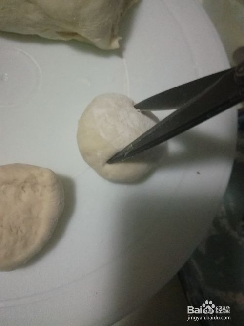 拿出一把剪刀在圆形面团上面横竖方向剪一下