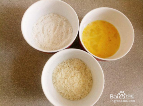 准备好面粉和面包糠,鸡蛋去壳搅拌成鸡蛋液。