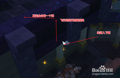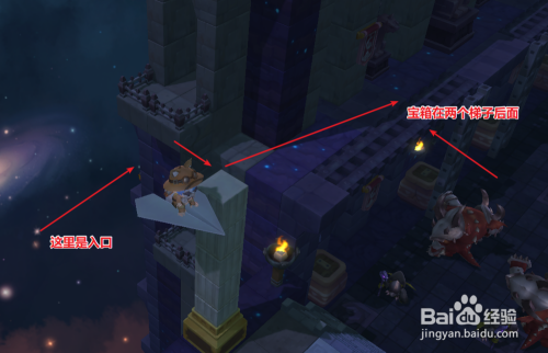 2号位置的黄金宝箱也非常隐蔽,它在小地图中可以看到在从左向数的激伐第二根柱子的上面,这个宝箱需要先飞到底下,然后将飞行坐骑飞到最高处,到最高处,向里直接飞进去即可摸到黄金宝箱。