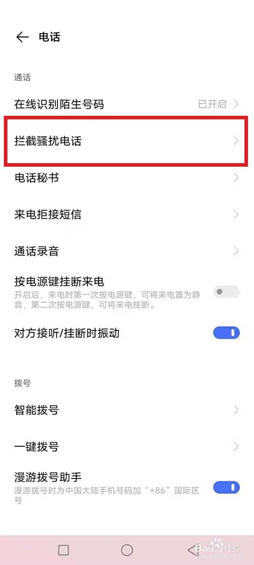 手机下拉屏幕进入设置,选择移动电话系统管理,查看拦截骚扰黑名单号码。