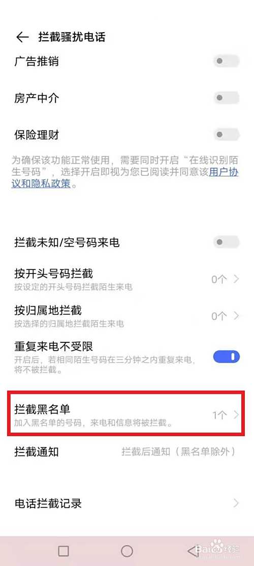 点击拦截黑名单,包括设置来电和信息被拦截的号码。