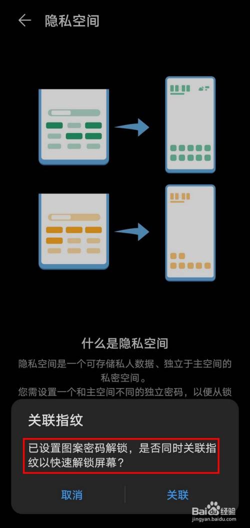 密码设置完成后,会提示是否“关联指纹”,指纹会方便一些,视自身情况设置,然后就可以点击进入隐私空间了;