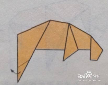 将折出的角的小角沿虚线向箭头方向折叠,作犀牛的角。