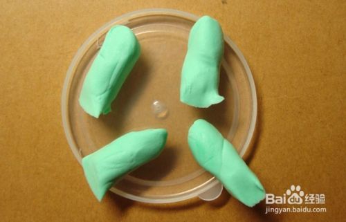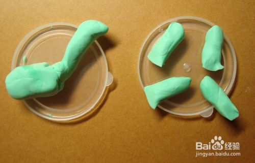 接着,取粘土揉成长条形,分成四份,作为可爱的小恐龙的腿脚部分。摆放在小盘子上,如下图所示。