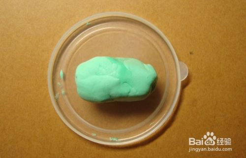 接着,用工具在粘土盒中取浅绿色的粘土,揉成一个大的长方形,作为可爱的小恐龙的身体,摆放在小盘子上,如下图所示。