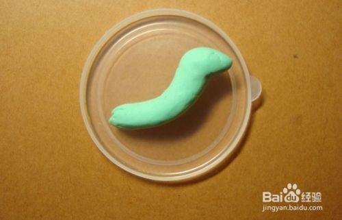然后,取浅绿色的粘土捏成长条形出来,作为可爱的小恐龙的头和脖子的部分,摆放在小盘子上,如下图所示。