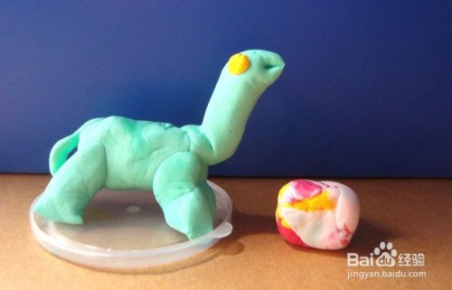 最后,取橘色的粘土捏成小恐龙的眼睛粘贴在头上,并取浅绿色粘土捏成尾巴,粘在恐龙的身体上,如下图所示。这样一个可爱的小恐龙就做好了。孩子们会非常喜欢的。大家按照以上的步骤,也来做做吧。