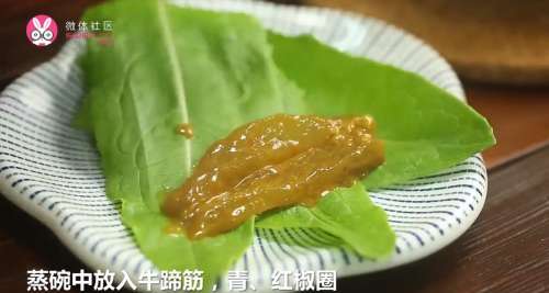 4倒入牛蹄筋中搅拌,蒸碗中放入牛蹄筋,青、红椒圈,大火蒸6分钟即可。