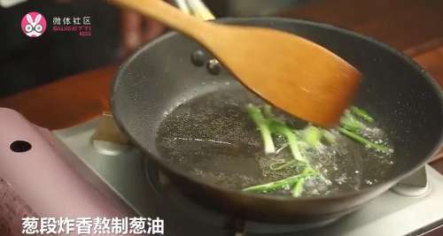 3牛蹄筋倒入拌匀裹上酱汁,起锅烧油,放入葱段炸香熬制葱油。
