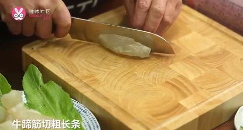 1牛蹄筋切粗长条,青、红椒切圈,青、红椒烫熟,牛蹄筋大火煮20分钟捞出控干水分。