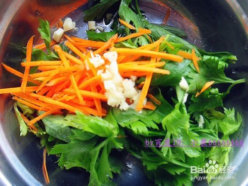 把胡萝卜切成丝和芹菜叶放在一起,再把蒜末撒在上面。