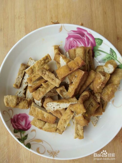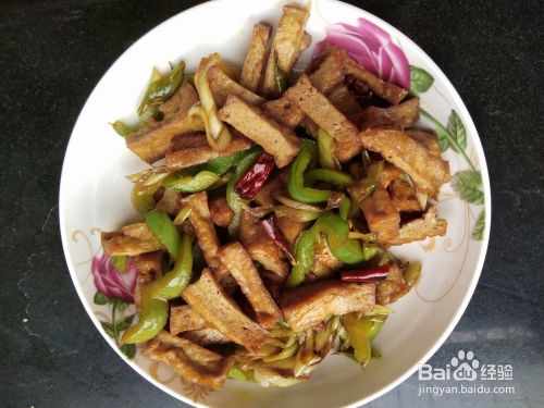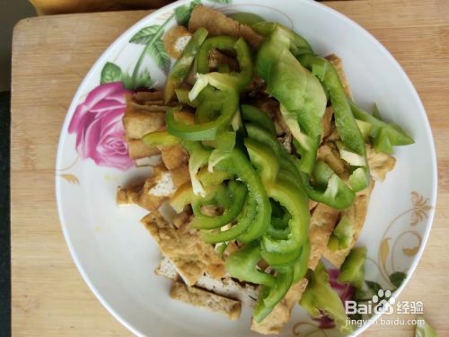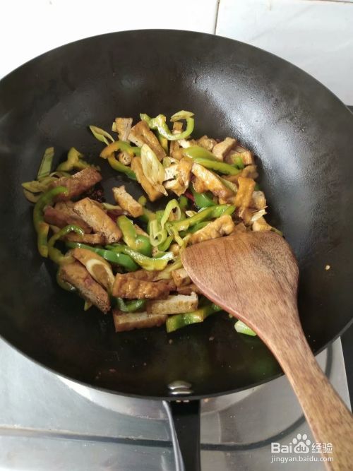 第三步,翻炒几下放入备好的豆腐条和菜椒丝,加入少量的盐,酱油,鸡精,五香粉,继续翻炒