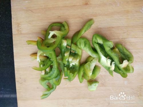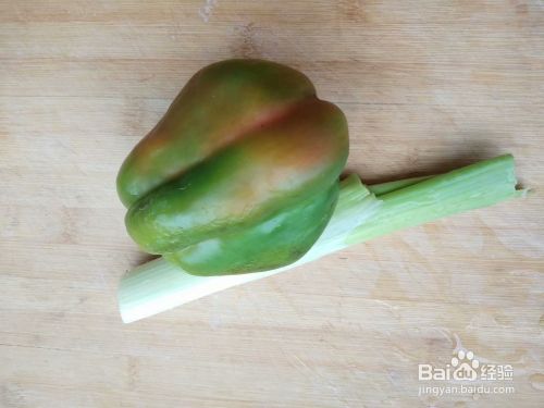 第一步,准备好要用到的食材,油炸好的豆腐块切成厚度均匀的长条,放入盘中备用,葱斜切成环,菜椒切成粗丝备用,花椒红尖椒备好