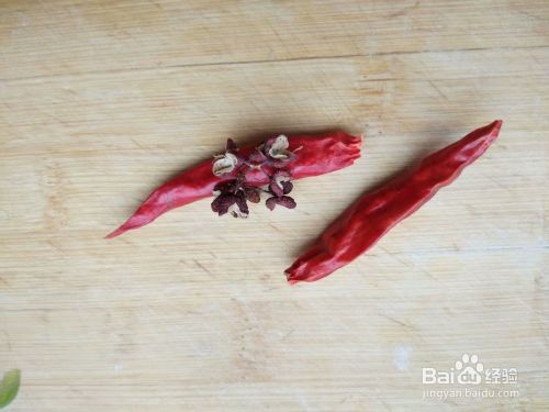 第二步,炒锅中加入少量食用油,顺便加几粒花椒,开火加热,油热之后放入红尖椒,再放入葱翻炒