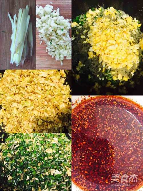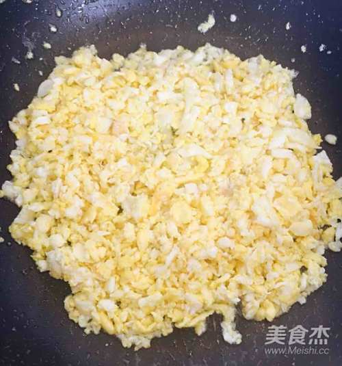 4炒蛋末:将鸡蛋放入油锅炒至八成熟然后出锅待凉后放入分好的韭菜和包菜盆中。tips:鸡蛋一定要等到凉了以后放进菜里,主要是防止韭菜会随高温的鸡蛋末释放水分。