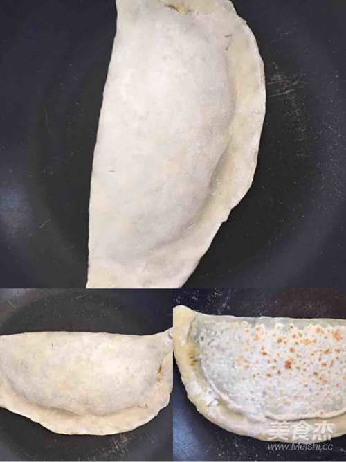 7上锅:将包好的盒子放入烧热的“干锅”里慢慢的烙(徐州人更习惯说“炕”)烙至一面金黄时翻到另一面继续烙!tips:火候很重要,火大了容易糊掉,小了把握不住时间。建议先开大火烧热锅后将火调至中档,大约两分钟翻一次“肚子”直到两面金黄。END