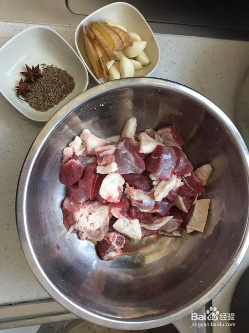 羊肉洗净切大块,羊肉最好选肥瘦都有的,我这个是朋友给的内蒙草原自己家养的羊,肥而不腻……大蒜剥好,姜切大块备用。