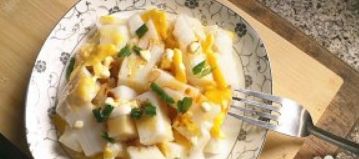淋上适量的酱油和美乃滋,撒上葱花,即可食用