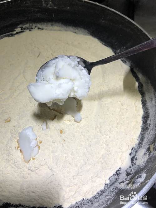 用干净的勺子舀一块羊油加入炒黄的面粉,不要一次性放太多,油多会腻。将羊油与炒面混合炒匀。