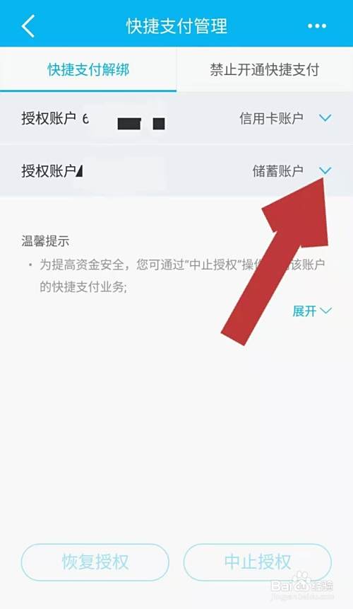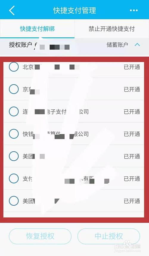 进入快捷支付管理页面后,点击银行卡后方如下图所指的图标,页面就会展示该银行卡授权的所有快捷支付的服务。