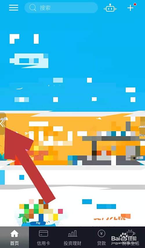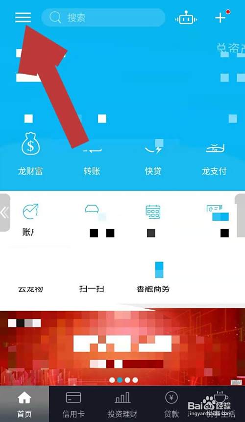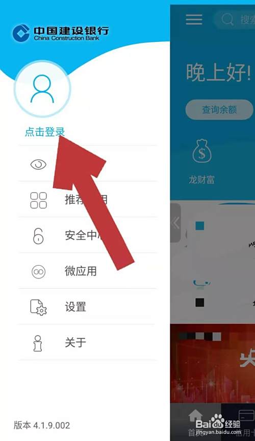 打开手机上的建行手机银行,点击页面左侧如下图所指位置的图标,进入手机银行个人中心页面。