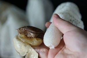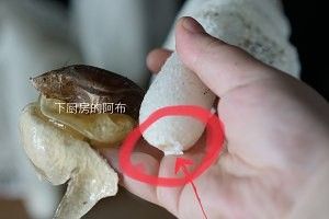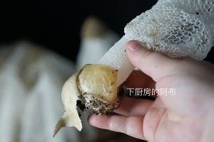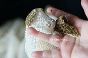 特别说明,底下这个小白环也是要去掉的。PS.平时我们炖干竹荪的时候,这个小白环更是要去掉哦。有些人会觉得干竹荪炖汤有点类似洗洁精之类的奇怪味道,主要就是来自底部一个小白环,去掉就会好得多。