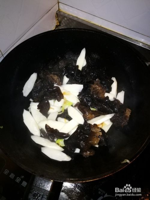 锅热倒入食用油炒香葱花,然后放入木耳和山药先翻炒几下