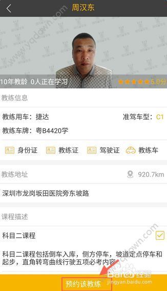最后,在教练详情页面,点击【预约该教练】按钮就可马上的预约教练学车哦。