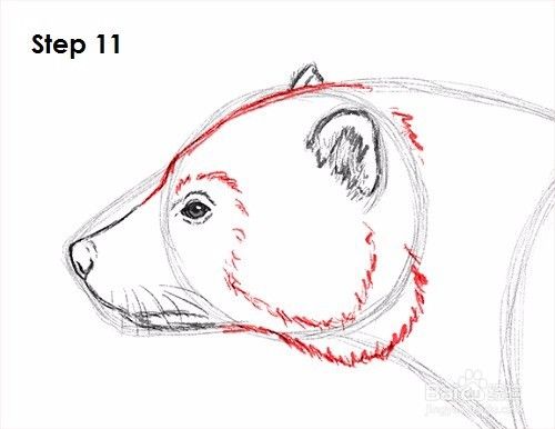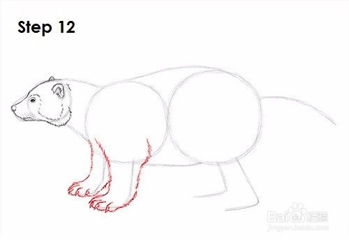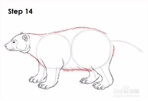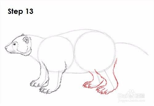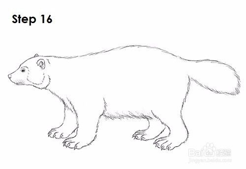 第13步:使用右侧的线作为指南,以相同的方式绘制后腿。当你遵循指南的路线时,记得要轻描淡写,并且只有在结构正确的时候才会使线条变暗。狼獾是短而强大的动物,所以不要把腿拉得太长。他们应该矮小和体壮。狼獾在每只脚掌上有五只脚趾,像熊一样平放在脚上,而不是像其他哺乳动物一样脚趾。另一边也绘制后腿。只能画出从这个角度可见的脚趾。