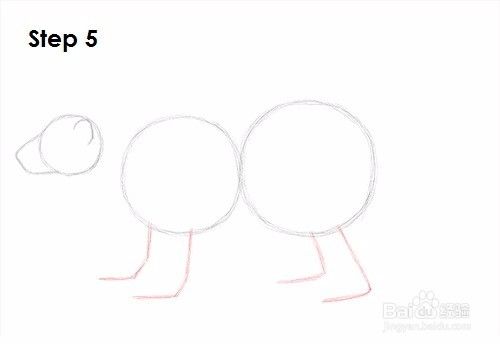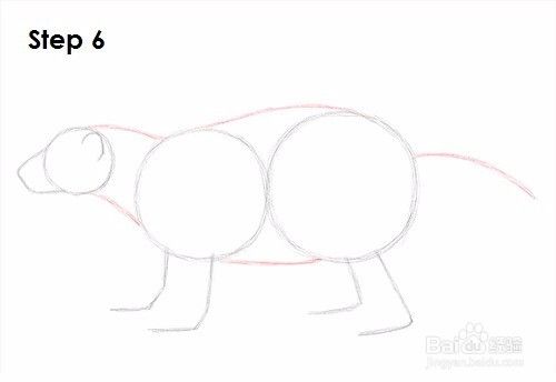 第五步:在狼獾的身体下画两条线(每圈下面两条)作为腿的导引。在提示处弯曲线条以指示脚的位置。