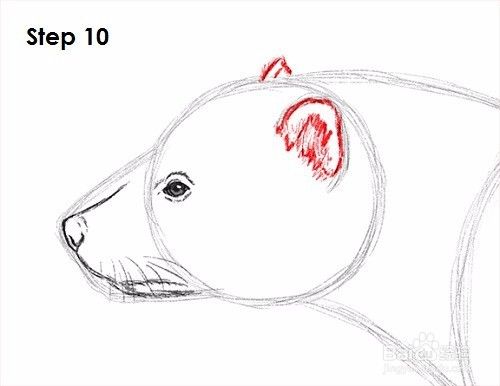 第10步:使用头部的小弧作为引导画出狼獾的耳朵。在皮草的耳朵形状内添加快速,短暂的抽吸。在另一侧的耳朵上画另一个小圆弧。