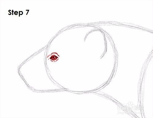 第7步:在左上角的圆圈内画出狼獾的眼睛。首先轻轻画一个类似于足球的形状,然后用较粗的线条使形状变暗。遮蔽眼睛内部,除了一个小点以代表眩光。在眼睛周围画几条线以获得额外的细节。在顶部使用快速,短的笔触来表示皮草。