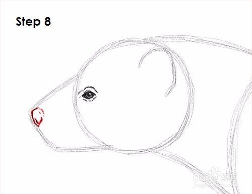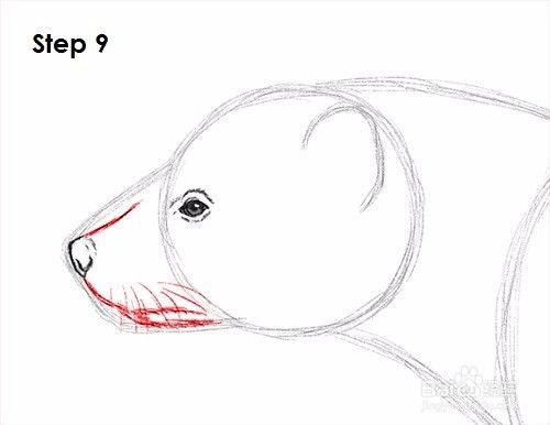 第9步:用弧作为指导,画出其余的狼獾枪口。弯曲枪口的顶部。对于嘴巴,在鼻子下方画一条线,向后伸向头部。在下巴下面画另一条线。在胡须的枪口上添加一些快速笔画。