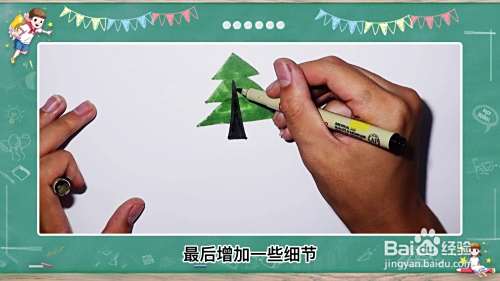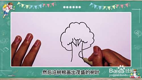 然后沿树根画出茂盛的树叶,接着用彩笔涂出颜色。
