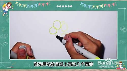首先用笔在白纸上画出几个圆形交叠在一起,然后用彩笔涂上不同的颜色。