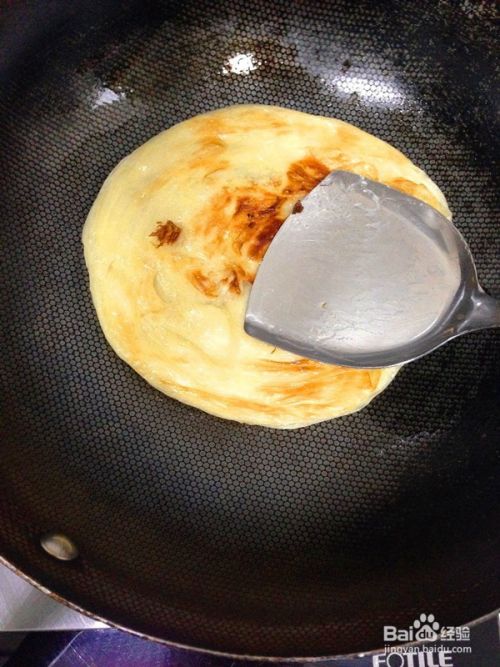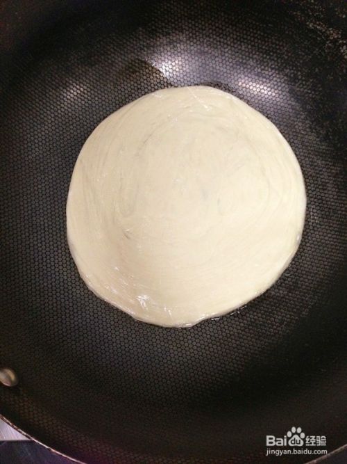 取一平底锅置于煤气炉上,锅底抹上一点油,将已经回温的手抓饼饼丕放入