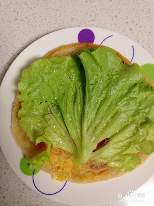 将处理好的生菜叶放在手抓饼的表面,盖在甜辣酱上。