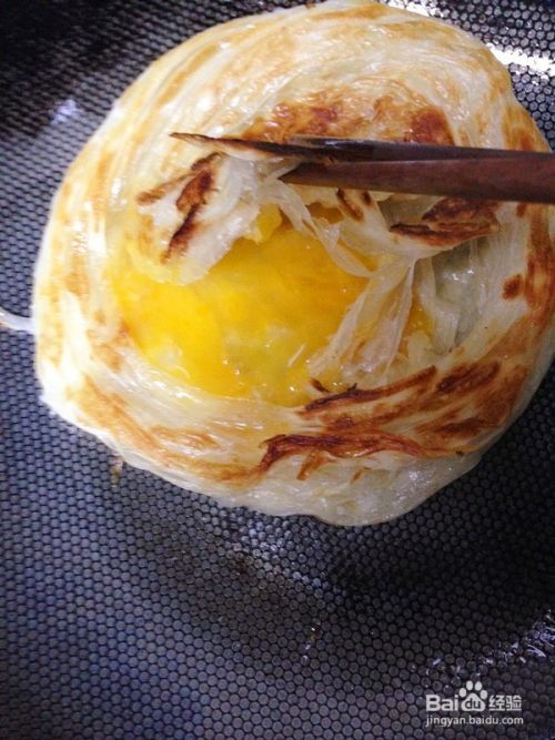 将打散的鸡蛋液从挑起的这角饼皮中倒入。