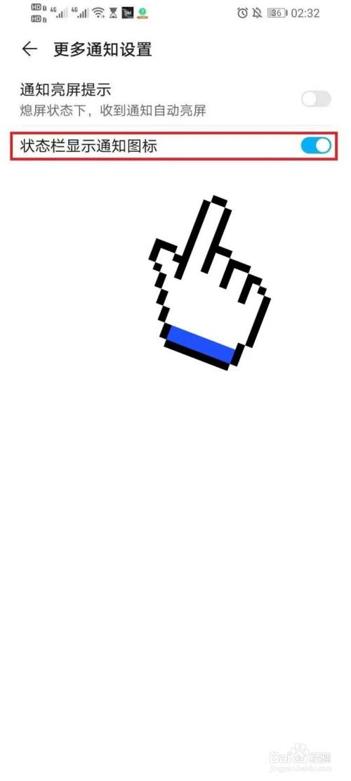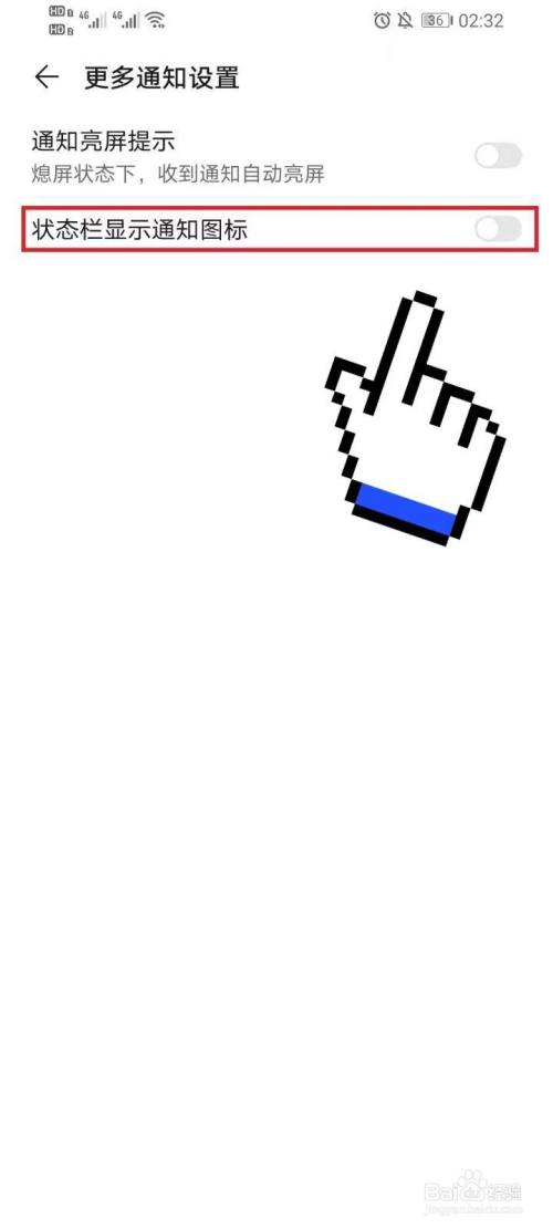 在更多通知设置页面,找到状态栏显示通知图标,点击右边开关按钮。