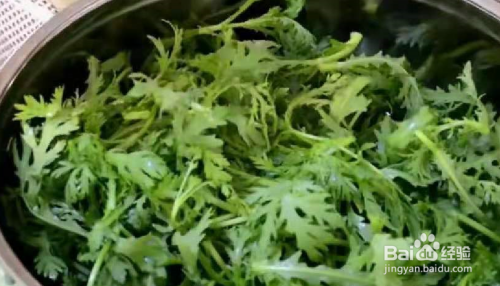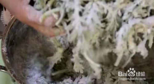 加入面粉,搅拌一下。大火把水烧开,放入拌好的茼蒿,蒸十分钟。