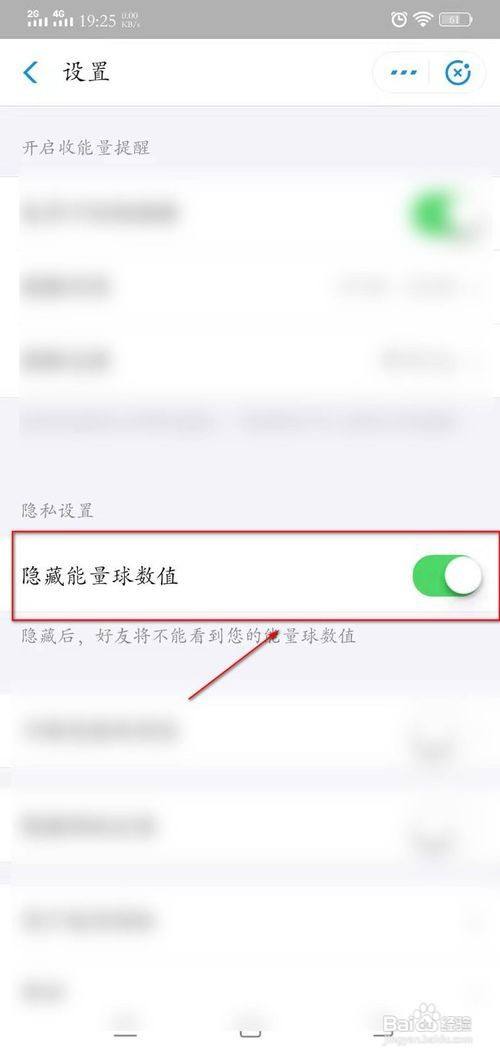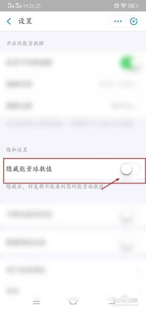 5、看到隐私设置下面的隐藏能量球数值,按下后面的按钮。