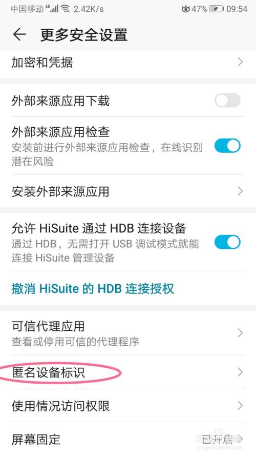 进入更多安全设置的页面点击【匿名设备标识】选项