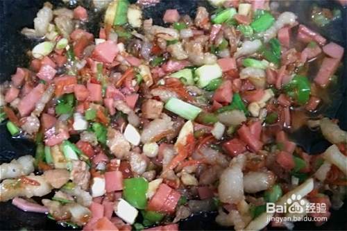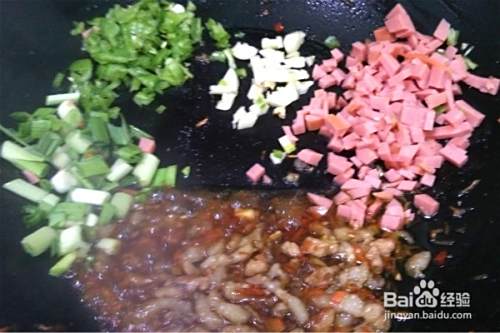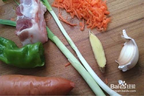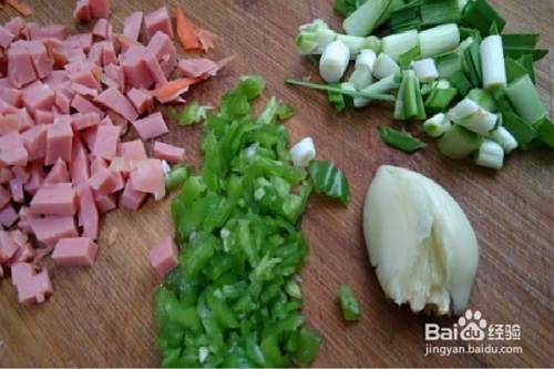 肉肠去肠衣切成小丁,青椒、蒜苗、五花肉等都切成小丁备用。