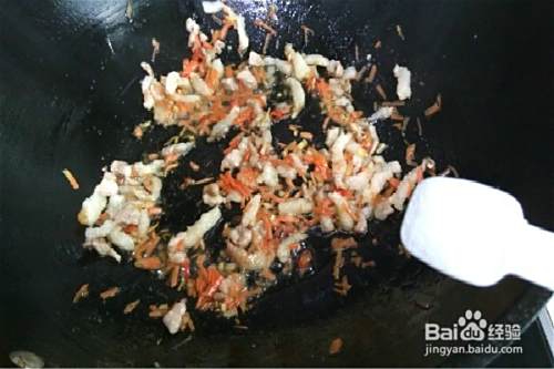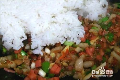 米饭倒在炒过的菜上,淋上一点开水,小火焖一会儿再中火翻炒,只要饭菜混合好了就行了(不可把饭粒炒得硬而干了)。
